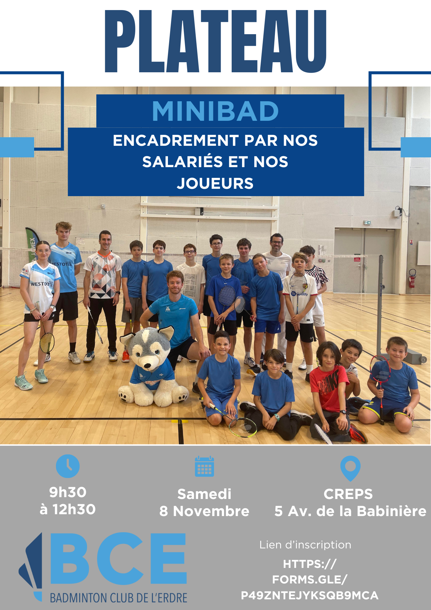 Le BCE vous invite à son plateau Minibad/Poussin qui aura lieu le  Samedi 8 Novembre au CREPS des Pays de la Loire.